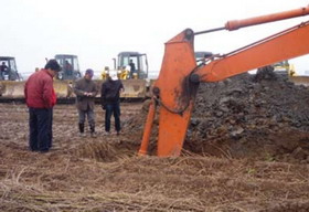 为了保证球场的建造质量,京津海的建造者多方请教当地的专家,采用强度排水,密封地表和控制径流相结合的方法,工地每天有二十多台排水泵和十几台发电机在不停地排水,完成造型的工程表面马上采取覆盖,地表集中排水等方法进行处理,如此建造虽慢却可保证造型质量和工程进度。但糟糕的是,要实现球场设计的效果,全场需要500多万的土方,完成的标高需比原地面平均高5.5米,并且如此大量土方的三分之二只能从外部引进。土方的到位,并不能一劳永逸,长期雨水的浸泡使地面基础变软,大型运输车辆根本无法将花钱买来的土运输到位。经过尝试多种方法,包括使用几公分厚的钢板和东北购买大量木杆铺垫防止车辆沉陷,最后唯一可行的只有砖渣铺路,这一铺就是八十多万方砖渣。